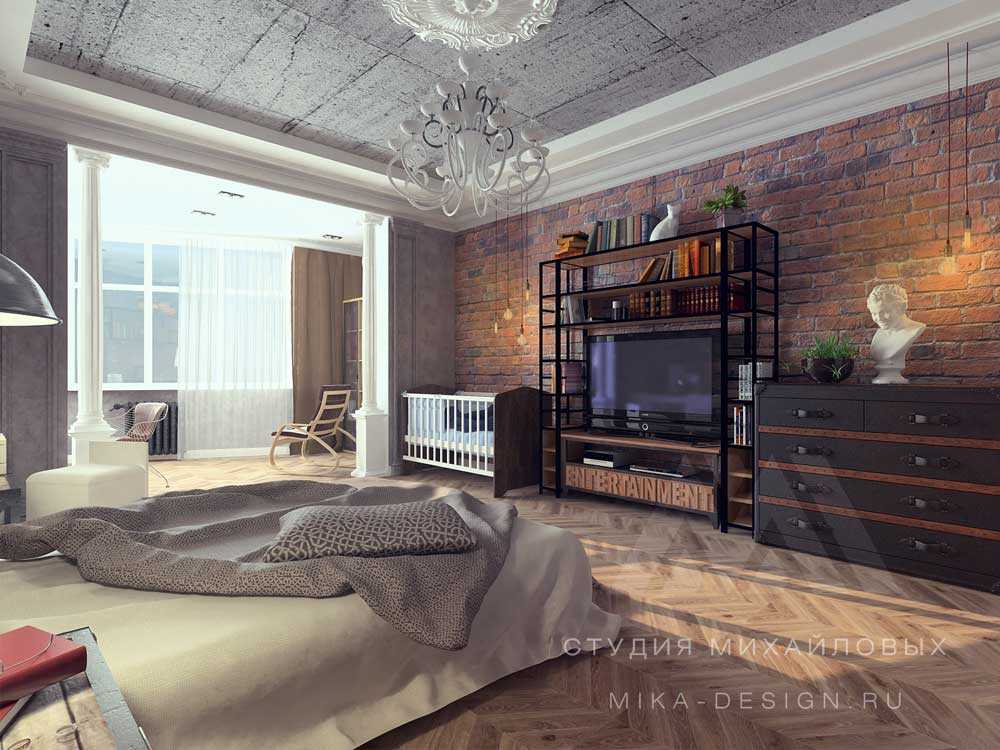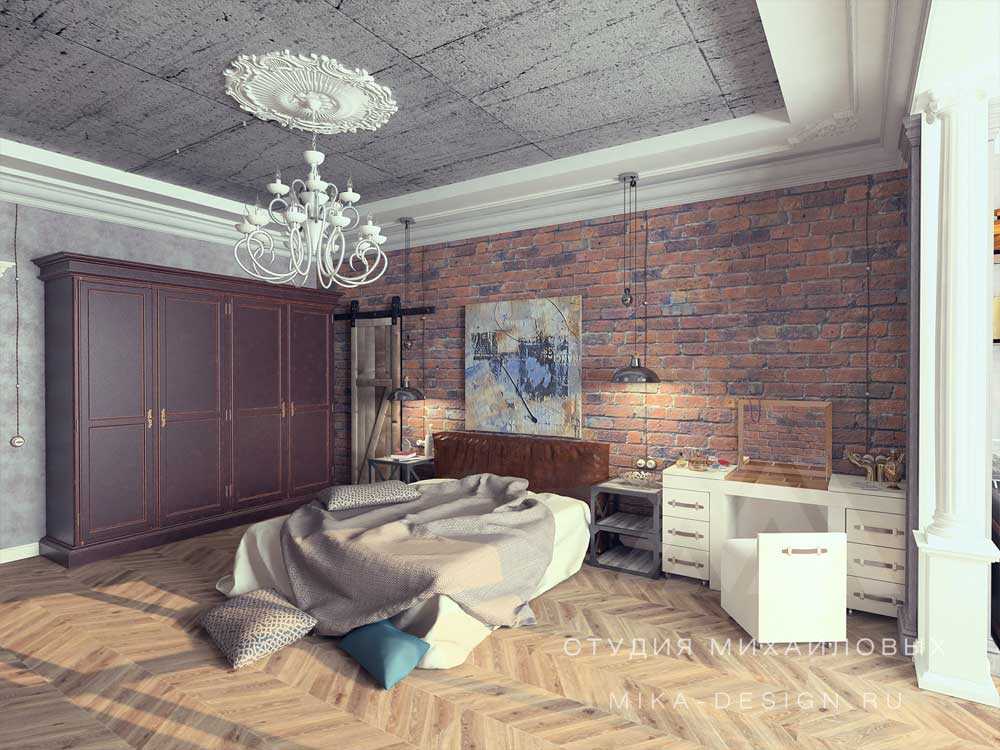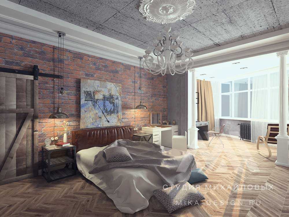 Спальная комната в стиле лофт – это не только модное решение, но и дорогое оформление. Главным элементом является, конечно же, кровать, которую предпочтительно сделать низкой и широкой или поставить ее на приподнятую ступеньку-подиум.
