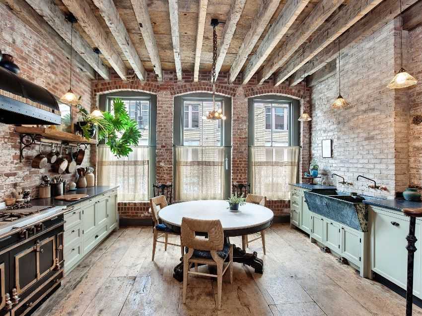 В кухне легко подчеркнуть индустриальность: старинная мойка, ретро-холодильник, печка-буржуйка и вентиляционные трубы хорошо сочетаются с современными кухонными агрегатами.