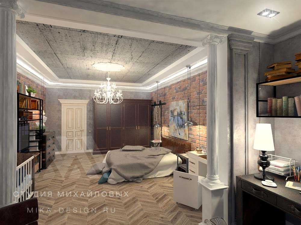 Спальня для гостей оформлена в едином для всей квартиры стиле – сочетании лофта и классики. Однако здесь особенно заметно влияние готики: из-за большого количества бетона и классического лепного декора глубокого серого цвета пространство становится похоже на интерьер старинного каменного замка.