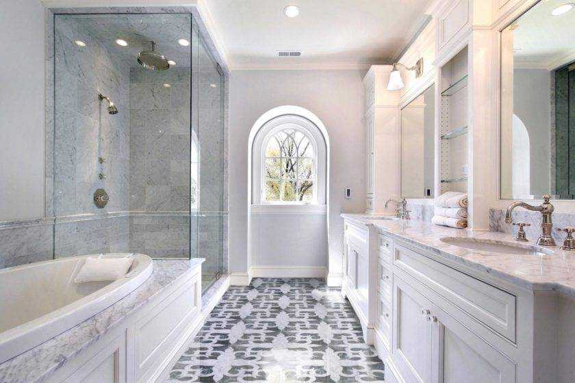 Можно, например, варьировать гладкий кафель и «мраморный» керамогранит с шероховатой текстурой. Такая поверхность больше подходит для пола, чтобы не было скользко.