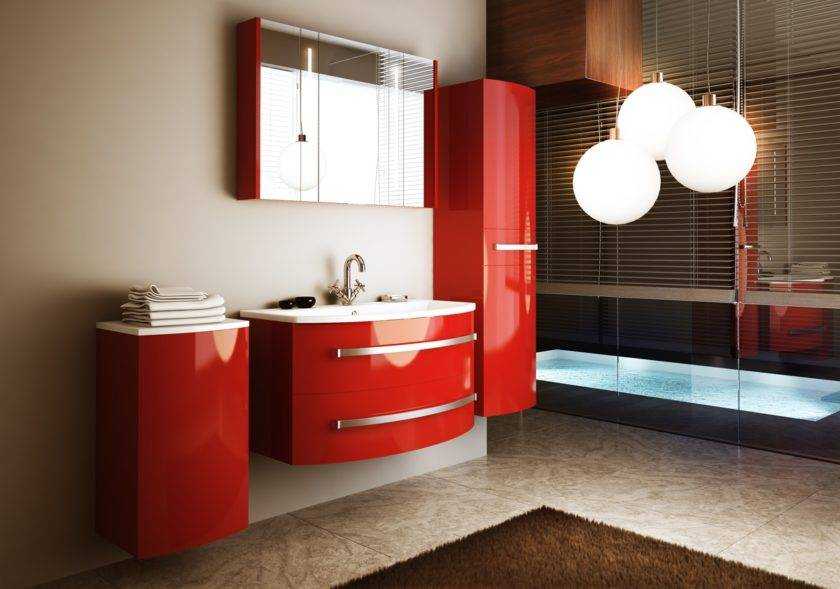 Оранжевая мебель хорошо впишется в интерьер ванной. Если в магазине не окажется подходящего оттенка, шкафчики, пеналы и полки можно сделать на заказ.