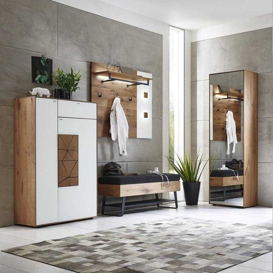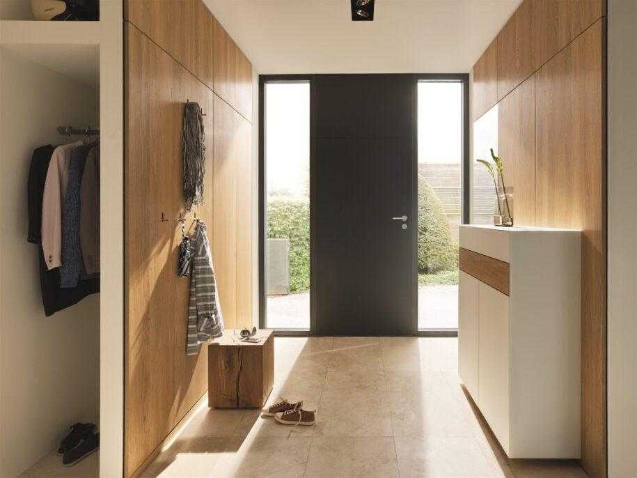 В вытянутой входной зоне важно не только разместить все необходимое, но и зрительно скорректировать пропорции. Для этого используйте: