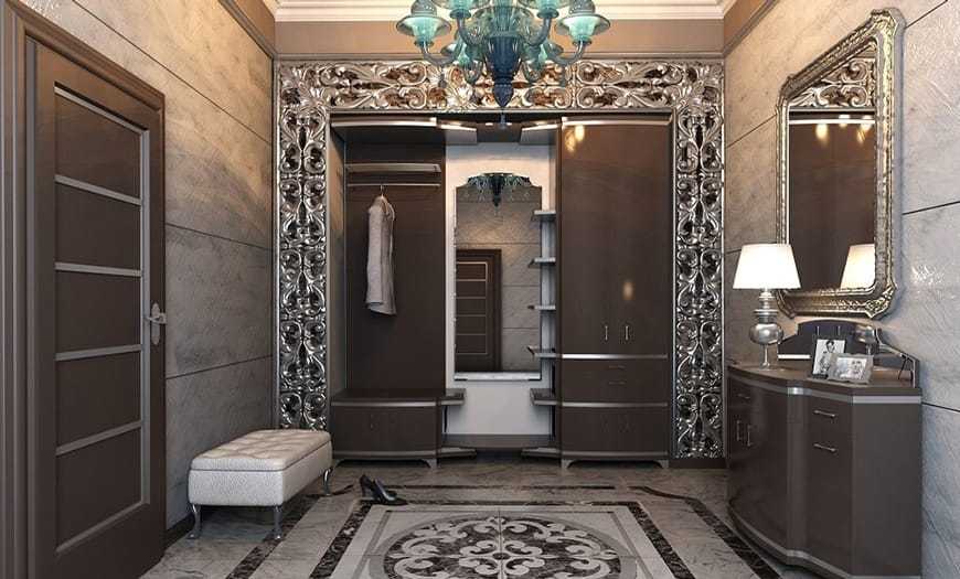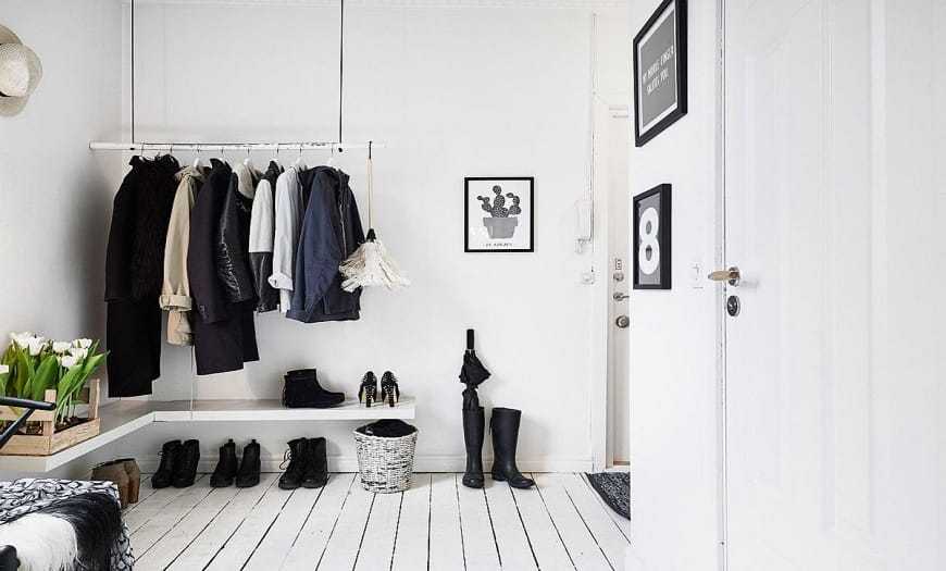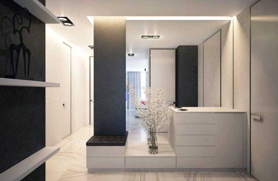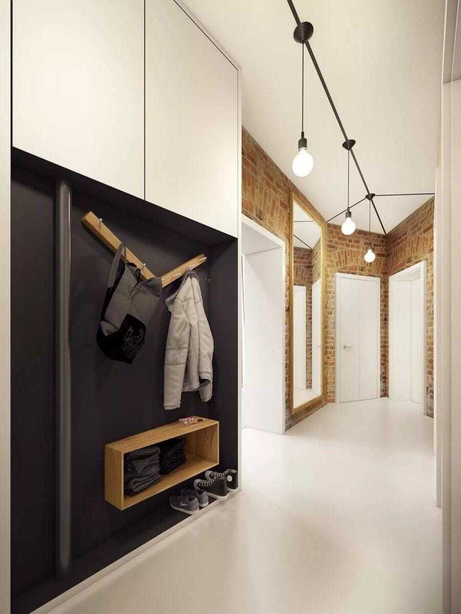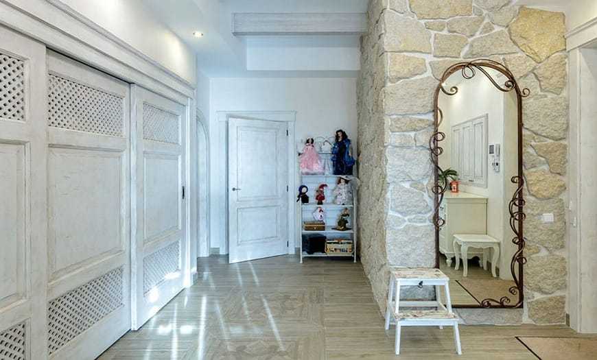 Проще всего работать с квадратом или не слишком длинным прямоугольником. С одной стороны от двери можно расположить встроенный шкаф, с другой — зеркало, вешалку с пуфом, этажерку или банкетку. Либо поставить всю мебель по одной стене, а вторую оставить практически пустой, добавив лишь немного декора или поставив красивое зеркало во весь рост.