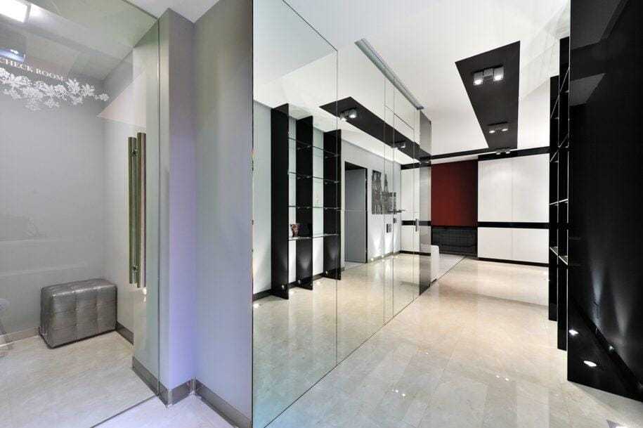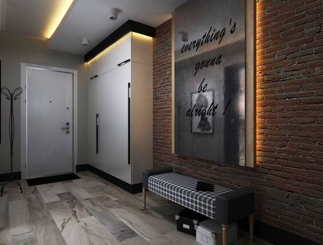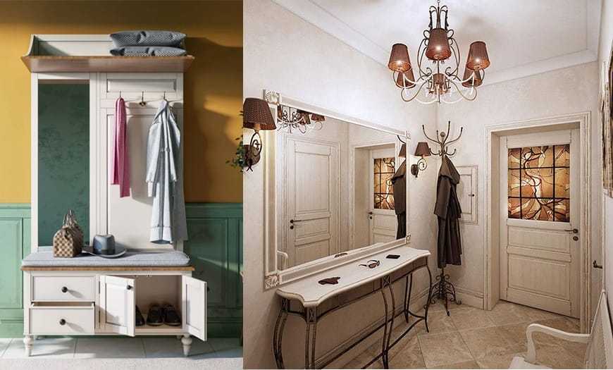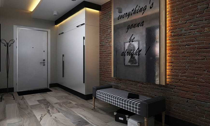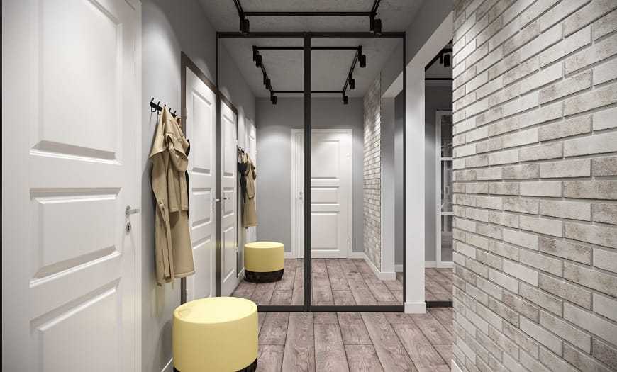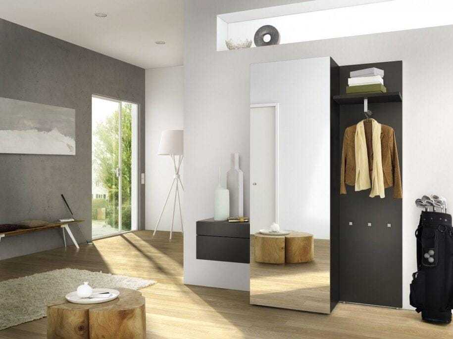 Проще всего работать с квадратом или не слишком длинным прямоугольником. С одной стороны от двери можно расположить встроенный шкаф, с другой — зеркало, вешалку с пуфом, этажерку или банкетку. Либо поставить всю мебель по одной стене, а вторую оставить практически пустой, добавив лишь немного декора или поставив красивое зеркало во весь рост.