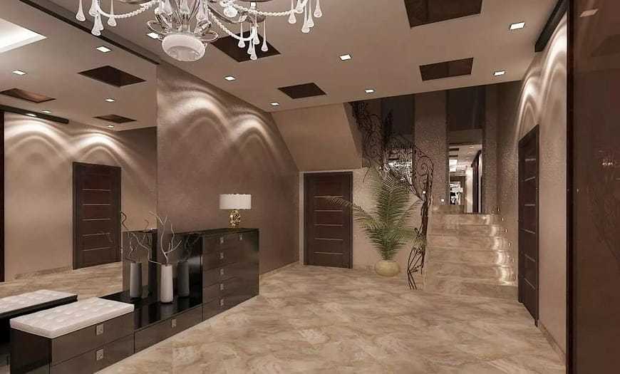 В оформлении холла размерами от 10 кв. м могут присутствовать крупногабаритные предметы мебели. Сочетание цветов должно соответствовать стилю интерьера.
