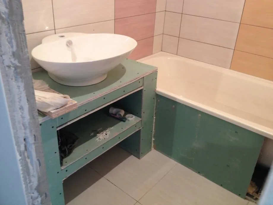 Гипсокартон. Влагостойким ГКЛ обшивают оцинкованный каркас, основу затем облицовывают подходящим материалом. Конструкция на прочном каркасе спокойно выдерживает вес раковины, а ее главные козыри – бюджетность и быстрое изготовление. Чтобы увеличить жесткость изделия, профили каркаса крепят к стене.