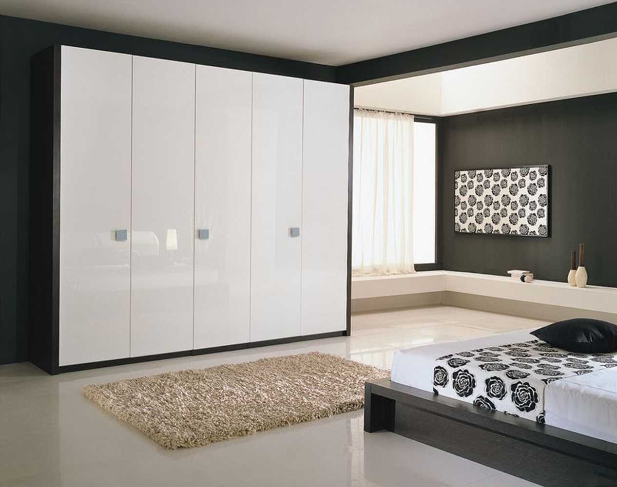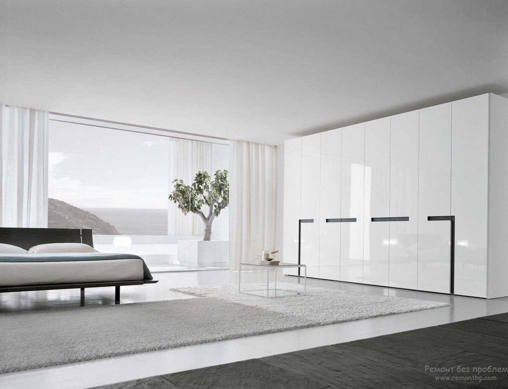 Использование глянцевых шкафов в помещениях с потолками аналогичного типа – неудачное решение. Глянцевая мебель смотрится достаточно выгодно только в том случае, если она обрамлена матовыми поверхностями и спокойными расцветками. Интересен вариант, когда верхняя часть мебельного комплекта (шкафы) покрыта глянцем, а нижняя (столы, тумбочки и так далее) – не имеет глянцевой поверхности.