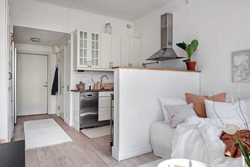 Еще одна маленькая сканди-квартира, в которой удалось разместить все необходимые функциональные зоны. Здесь нашлось место для кухни, спальни, обеденной группы — и все это на 26,1 кв. м. Секрет — в полуперегородке, отделяющей зону готовки от спального места.