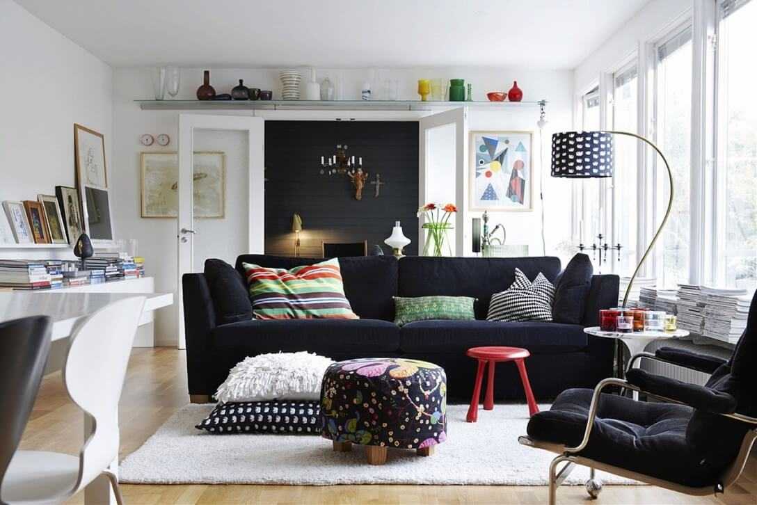 Обивка дивана или его подушки могут стать прекрасным цветовым акцентом. Хотя скандинавский стиль подразумевает идеально белые и однотонные стены, фрагмент или одна стена в комнате может быть выкрашена в контрастный цвет. Композиция будет смотреться весьма эффектно, если текстиль будет вторить выбранному цветовому пятну.