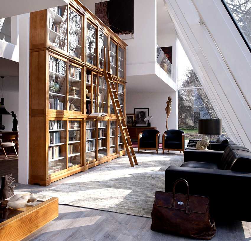 Классика размещения книжных шкафов и стеллажей. Тематика литературы, размещённой в подобном помещении, должна быть серьёзной – это подчеркнёт статус хозяина дома. В то же время, издания, расставленные вдоль одной из стен дома или в угловых книжных шкафах библиотеки, добавят уюта без излишней «показухи». Для подобных помещений обычно приобретаются стеллажи из более дорогих материалов. Чаще всего, это книжные шкафы для домашней библиотеки из массива.