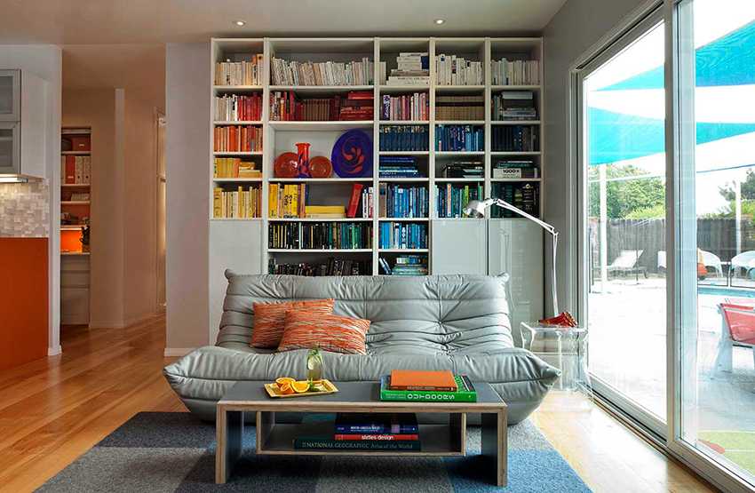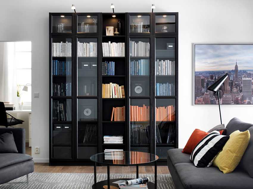 В гостиных малогабаритных квартир предстоит найти место не только для книжных стеллажей, но и для других элементов мебели. В подобном случае приходится зонировать все пространство, а также подбирать подходящий по габаритам и стилю книжный шкаф.