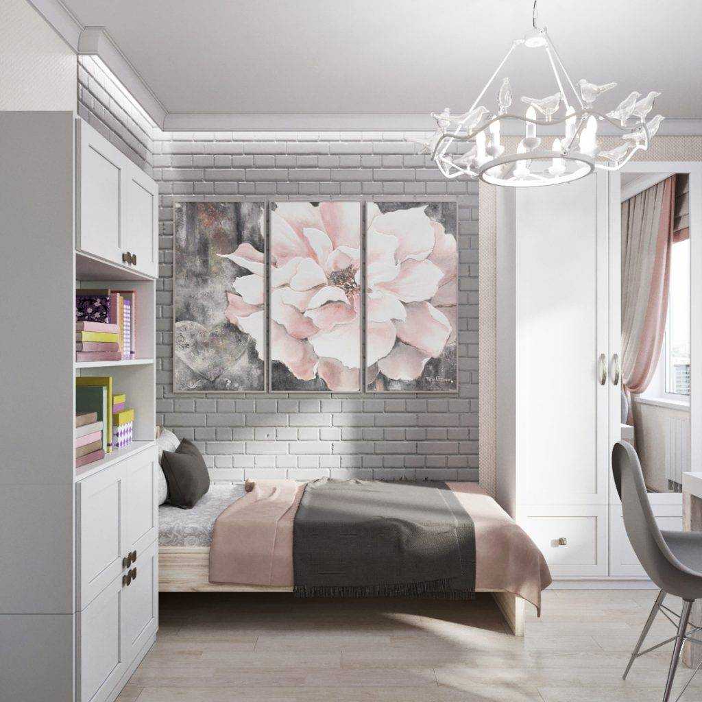 Стильный, лаконичный интерьер комнаты практичен и функционален. Мягкий серо-розовый тон мечта каждой леди. Нежно-розовый цвет органично вписывается в интерьер. Интересным решением оформления становится триптих с изображением цветка, перекликаясь по цвету с текстильными элементами, картина помогает выгодно расставить необходимые акценты.