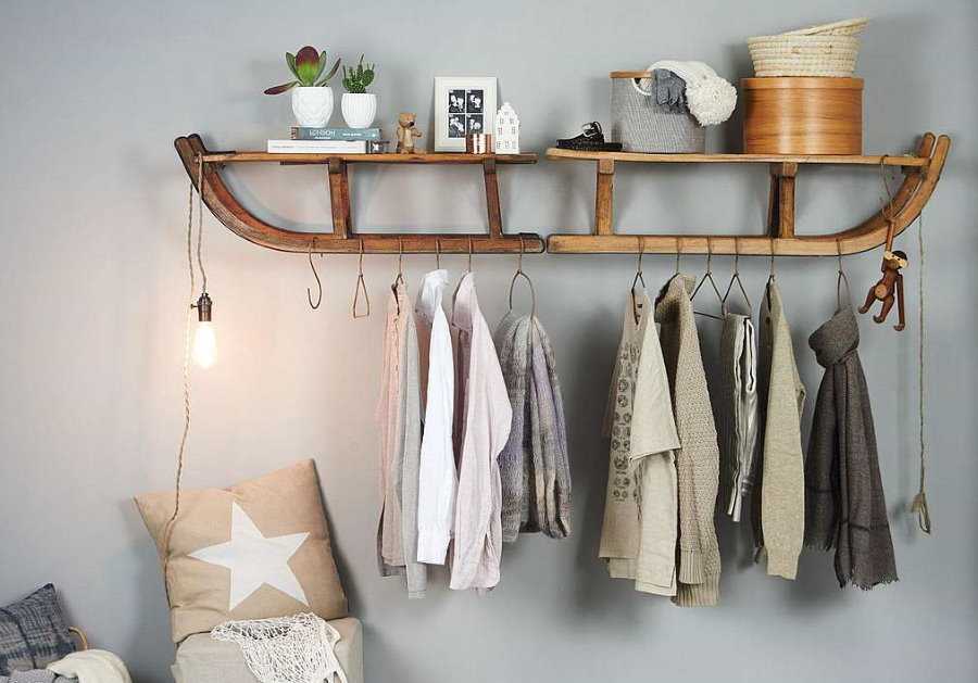 Оригинальная вешалка в форме санок в прихожей скандинавского стиля