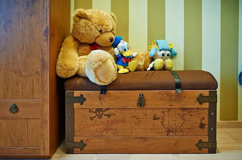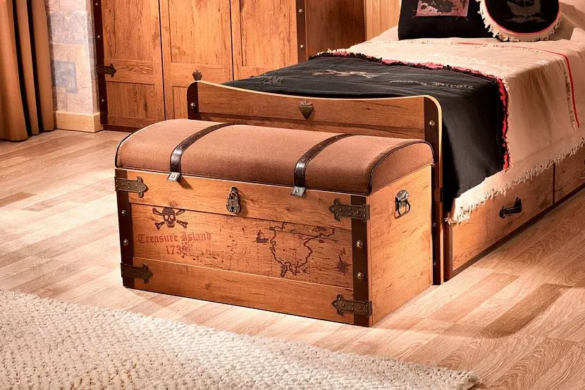 Для создания подобной тумбы можно прикрепить ножки к чемодану, объединить несколько кейсов или положить изделие прямо на пол. Предмет можно превратить в туалетный столик, при этом одна из его половинок будет удерживать зеркало. В интерьере этой комнаты хорошо будет смотреться старинный деревянный сундук, в котором удобно хранить постельные принадлежности.