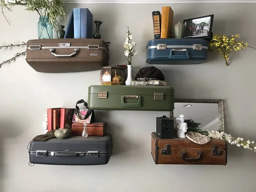 Милые безделушки и небольшие красивые вещицы создают в комнате особую атмосферу, хранят воспоминания и отражают личность владельца. В квартирах часто не хватает места для размещения приятных мелочей, поэтому более удобно расположить их на полках. Старые чемоданы способны послужить материалом для изготовления таких полочек. Лучше использовать несколько кейсов для создания гармоничного ансамбля. Можно применять даже очень изношенные изделия, после некоторой обработки они примут красивый вид.