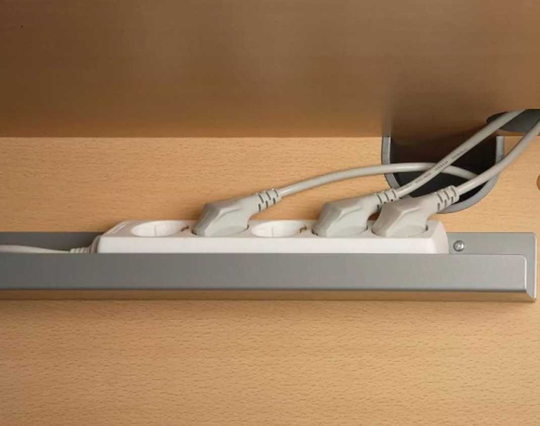 Вначале нужно закрепить удлинитель. Лучше это делать по центру, приближаясь к стенке. После на шурупы усадите биндеры. В удлинитель воткните все необходимые провода. Скрепите их между собой специальными зажимами. Благодаря этому провода не будут путаться, и мешать вам. Также стол останется чистым и аккуратным.