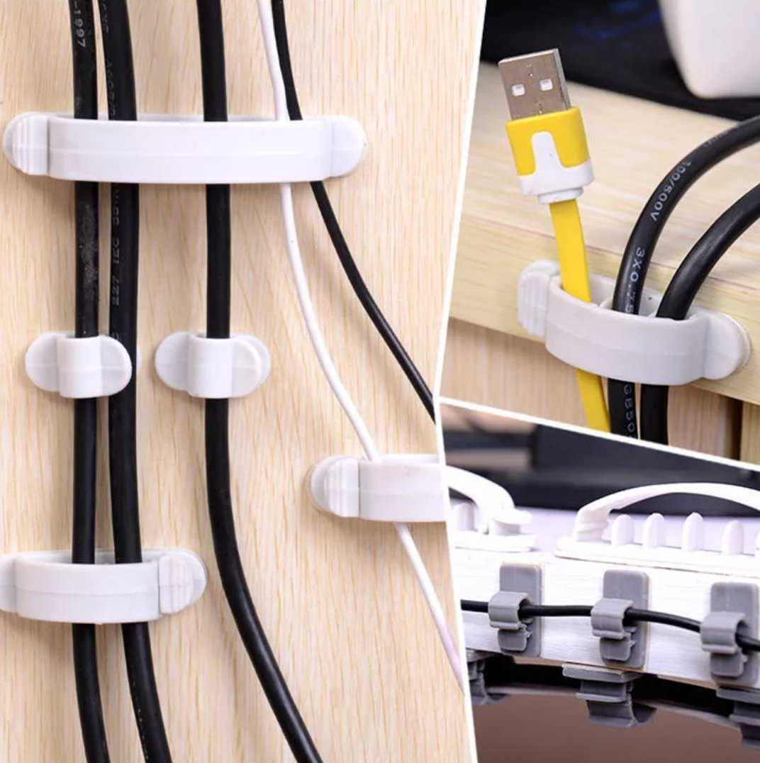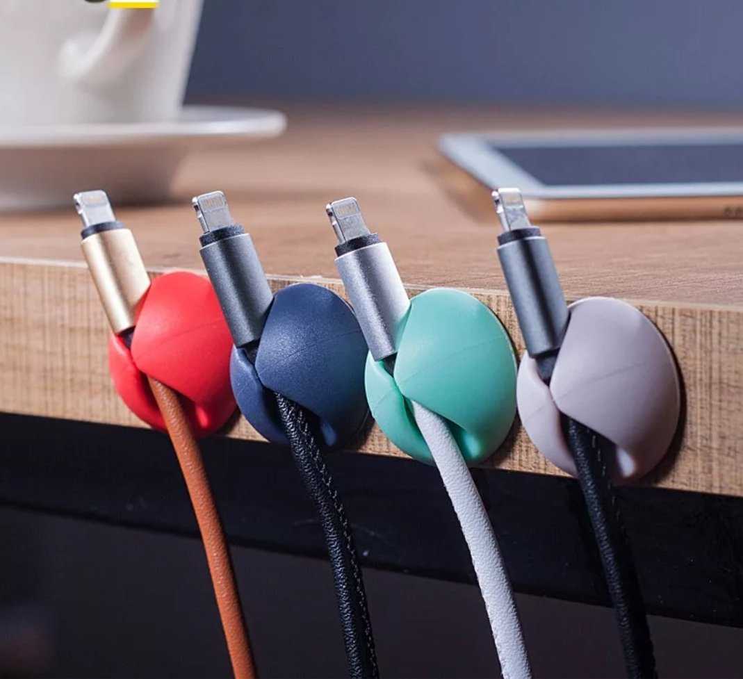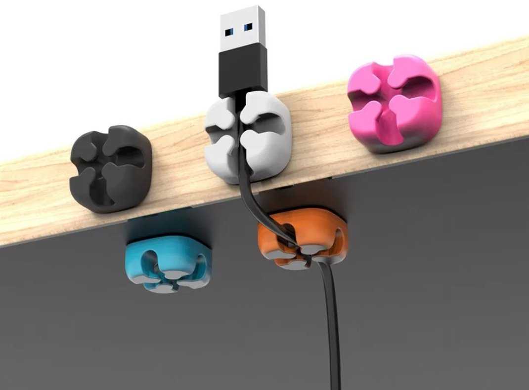 Еще один вариант — силиконовые или пластиковые держатели для кабелей, которые крепятся к столу. Они продаются как поштучно, так и набором, стоимость варьируется от 100 до 500 Р.