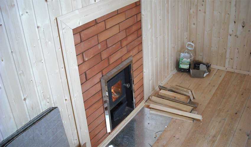 С отступом в 50 см от стенок горловины топки устанавливаются вертикально два бруса 100х60 см, они плотно примыкают к обкладке печи. Брусья выравниваются в плоскости перегородки и закрепляются посредством стальных уголков к полу и потолку. От этих балок в обе стороны устраивается каркасная стена со слоем утеплителя 100 мм, деревянная вагонка нашивается по горизонтальной обрешетке из 20 мм планок.