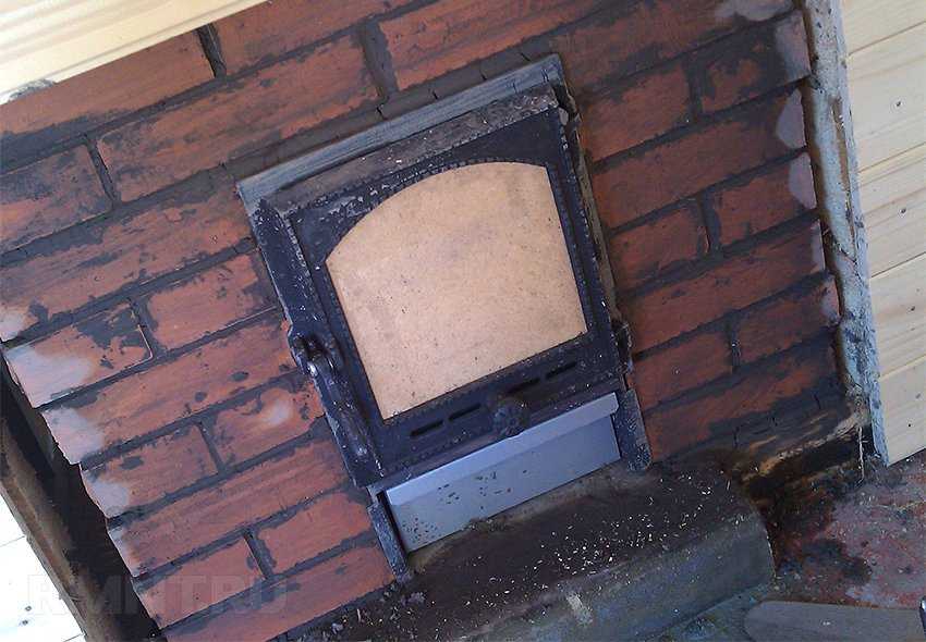 Пространство между брусьями закладывается пустотелым глиняным кирпичом, горловину топки нужно аккуратно обложить с обеих сторон. Связующее для кладки — смесь цемента, песка и шамотной глины в соотношении 1:2:5. Смесь глины с песком замачивается на сутки, цемент добавляется непосредственно перед использованием. Учтите, что обе стороны стены будут видны, поэтому кладку рекомендуется выполнять по стальным пруткам 10 мм толщины, а доборы аккуратно подрезать болгаркой.
