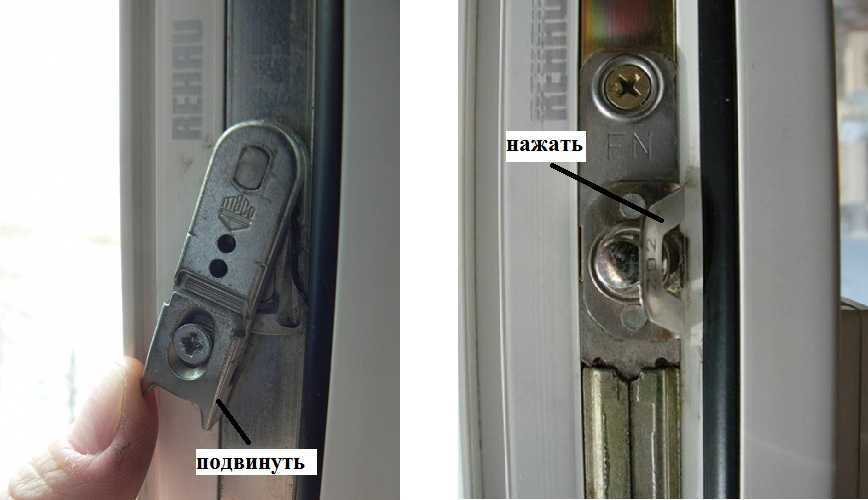Иногда и эта регулировка не помогает. Тогда требуется прижать верхний угол к раме. Для этого есть другой винт — на поворотно-откидном механизме. Чтобы был доступ к этому винту, придется открыть окно сразу в двух положениях. Для этого створку открывают, прижимают блокиратор. Он обычно бывает двух конструкций — в виде запорной петли или язычка (смотрите на фото ниже).