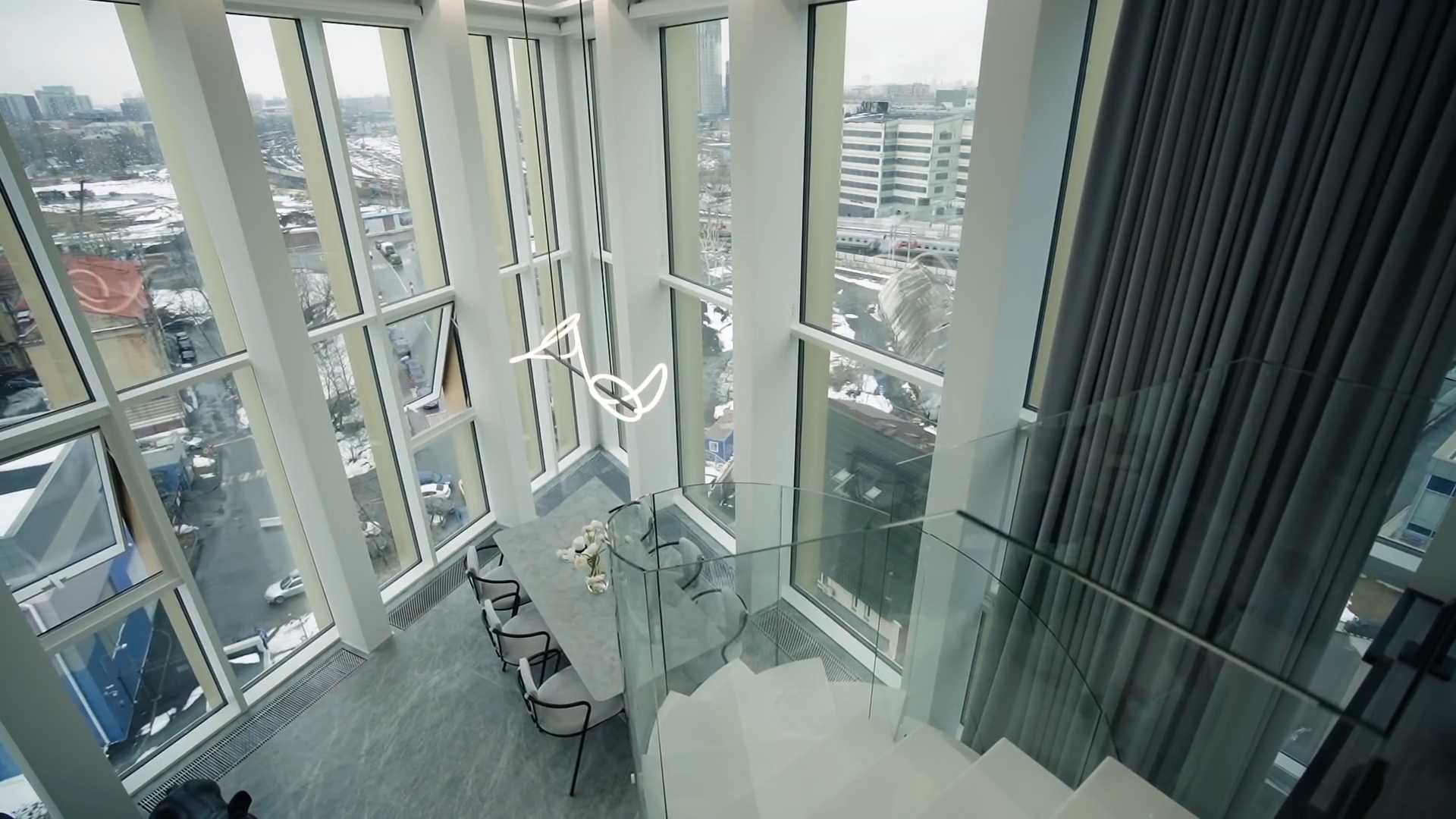 Особо привлекательной деталью интерьера является лестница с перилами из прочного стекла, которая ведет на антресольный этаж.