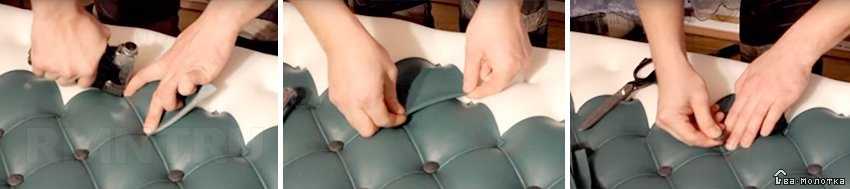 Далее приступают к установке пуговиц (гвоздиков, страз). Чтобы это сделать, через натянутый материал необходимо найти отверстия и сделать на их месте небольшие дырочки. В этом поможет дрель с тонким сверлом. Затем к пуговицам или гвоздикам со стразами прикрепляют шнуры. С изнаночной стороны их нужно вытянуть с помощью крючка или иголки и закрепить прочно мебельным степлером. Если используются декоративные гвозди, тогда их аккуратно вбивают в основу. И те и другие должны быть на одинаковой глубине в обивочной ткани. После того как работа будет выполнена, остается только аккуратно выровнять все складки палочкой или крючком.