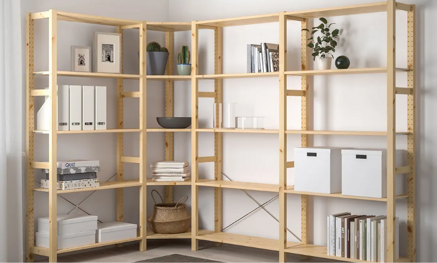 Свободное пространство в углу комнаты можно заполнить угловыми стеллажами от Икеа. Причем такой стеллаж не только заполнит пустоту, но и позволит максимально эффективно использовать свободное пространство.