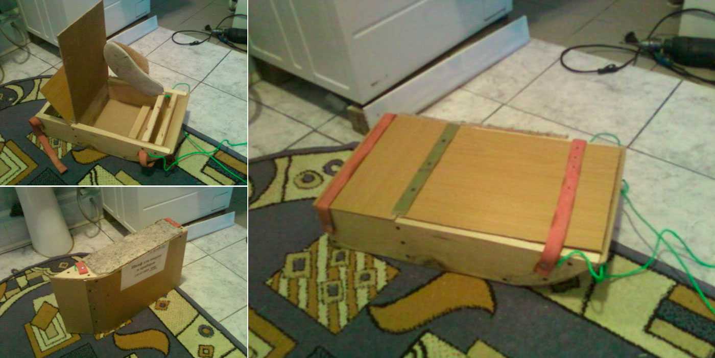 - после крепления каркаса к задней части саней, к их основе приклеиваются две палочки от мороженного;