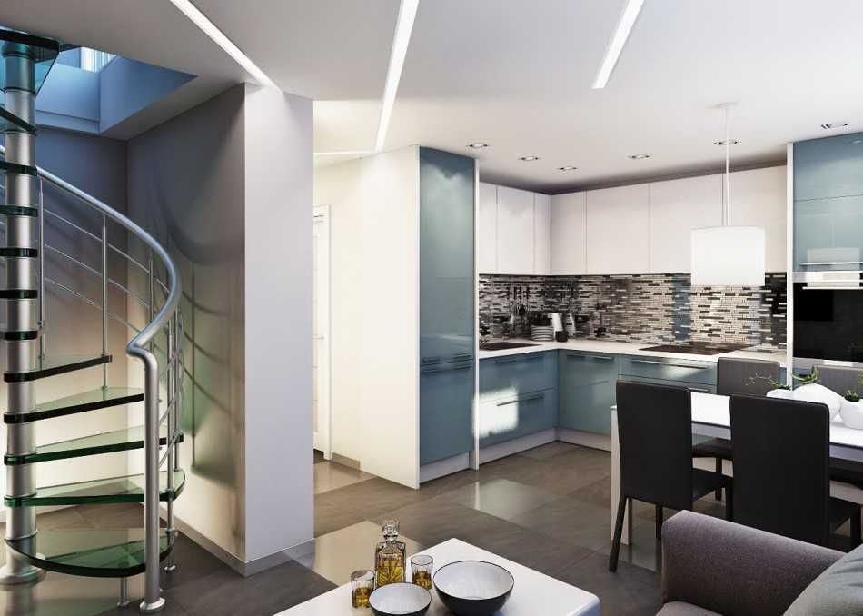 — максимальная изоляция уровней квартиры. Благодаря этому шум из гостиной на первом этаже будет меньше слышно в спальнях или рабочем кабинете второго уровня;