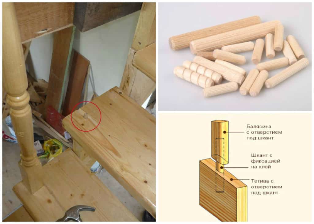 Отверстие в ступени под шкант назначается на удалении от края, принимаемым в 1/2 от ширины основы балясины. Далее устраиваются отверстия, внутрь вклеиваются шканты. Они возвышаются над поверхностью на 10-15 мм.