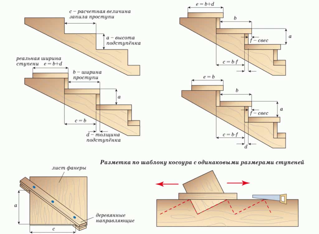 Доски размечаются по длине и подрезаются по требуемым параметрам. На них откладывается высота подступенка и величина проступи, вычитая от расчётных габаритов 20-40 мм.