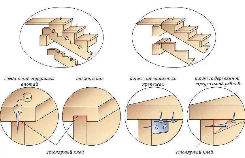 Затем монтируются ступеньки. Их длина принимается больше расстояния между двумя крайними косоурами на 10-20 мм. Ширина должна превышать величину гребёночного выступа на 20-30 мм. Ступени закрепляются на подступенках посредством саморезов. Шляпки глубоко утапливаются в материале.