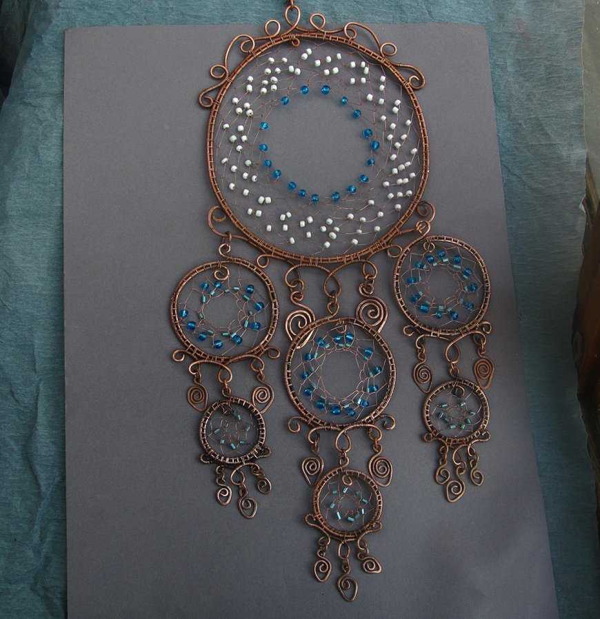 Еще один вариант ловца снов своими руками — это поделка из бисера. Для такого изделия понадобятся бисер и проволока.