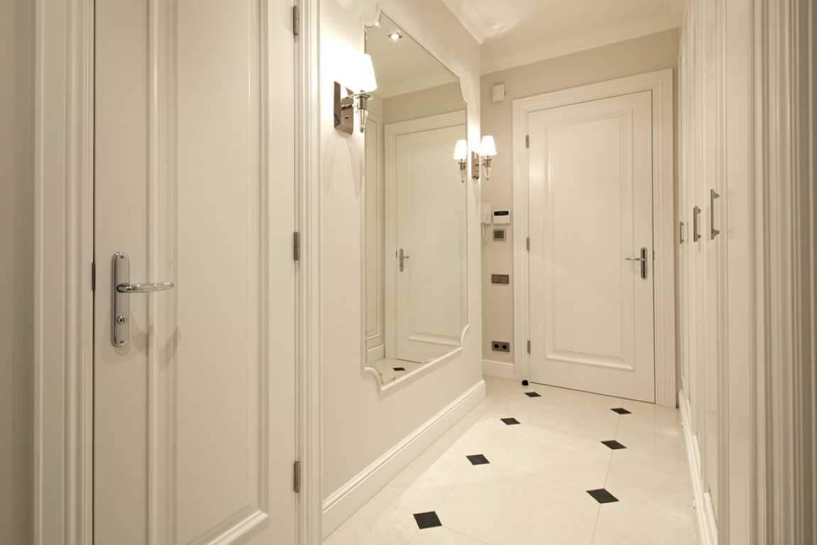 Наиболее просторной выглядит миниатюрная прихожая с межкомнатными дверцами, украшенными зеркальными и стеклянными вставками. Привнести в помещение ещё больше света можно посредством проёмов без дверей и арочных конструкций, декорированных занавесками.
