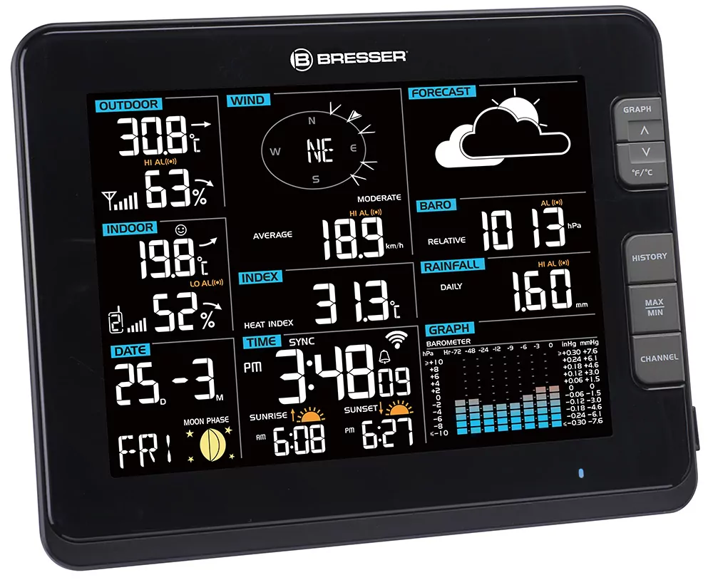 - Ragova Radio метеостанция для дома, 8 в 1 с наружными датчиками, прогнозом погоды, температурой, атмосферным давлением, влажностью, датчиком дождя, скорость ветра, температуры точки росы, фразами луны и будильником. Прибор обеспечивает точность измерений из-за улучшенной зоны приема. Данные на мониторе хорошо видны под разными углами.Информационные области разделены и классифицированы. ЖК-дисплей премиум-класса с постоянной подсветкой может использоваться на открытом воздухе. Стоимость 11 700 руб.