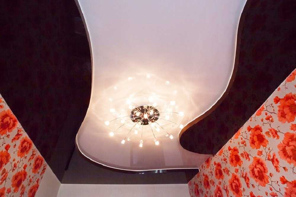 ПВХ изделия доступны пользователям в разных вариациях. Дизайн полотен достаточно разнообразен. Здесь каждый потребитель может найти свое: кто-то ищет чистый белый цвет, а кто-то хочет индивидуальное цветовое решение. Некоторые останавливаются на многоуровневых потолках (фото представлено ниже). Такие конструкции желательно выполнять в глянце. Они выглядят более презентабельно, нежели матовые. А, используя соответствующие источники света, можно добиться оригинального дизайна.