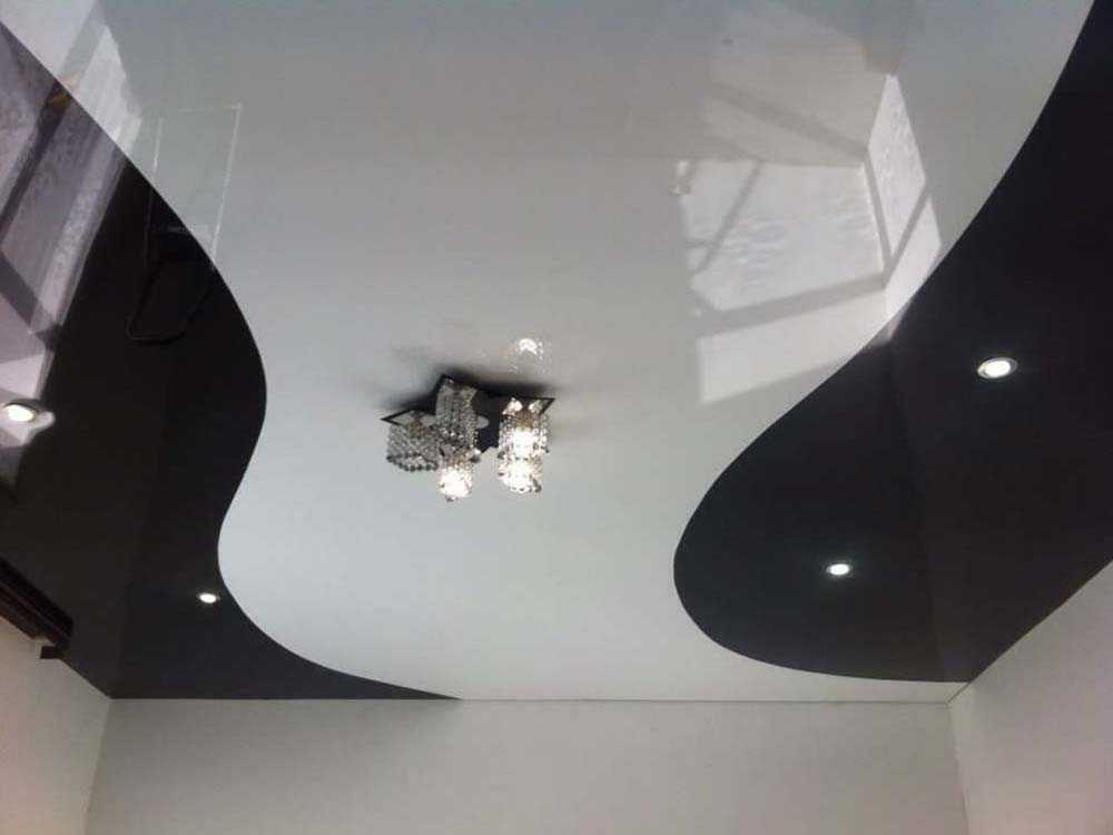 Многокрасочное решение можно получить только, комбинируя полотна разного цвета. При этом фрагменты пленок разных цветов соединяются методом сварки. Шов очень прочен, и на степени натяжения изделия не сказывается. Двухцветный натяжной потолок в зале практически всегда комбинируется из фрагментов контрастных цветов. Черный и белый, красный и белый – решения для стиля хай-тек, техно, минимализм.
