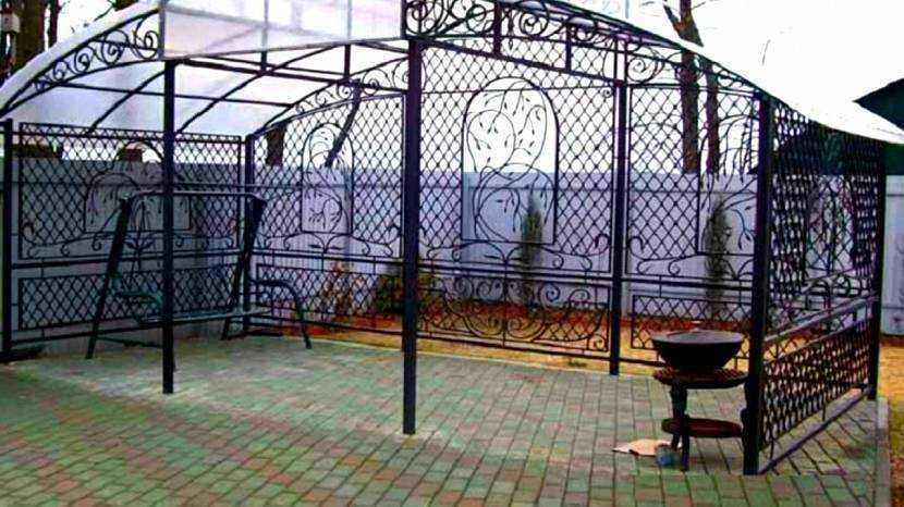 Каркасы из металла потребуют профильной трубы диаметром 8 сантиметров для опор и четыре – для обрешетки. Можно использовать в конструкции стальной уголок. Для жесткости каркаса используют железные косынки.