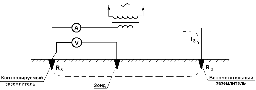 Для проведения измерительных работ необходимо искусственно собрать электрическую цепь, в которой ток течет через испытуемый заземлитель и токовый электрод (его еще называют вспомогательным). Также в этой схеме задействуется потенциальный электрод, назначение которого – замер падения напряжения во время протекания электрического тока по заземлителю. Потенциальный электрод нужно расположить одинаково далеко от токового электрода и испытуемого заземлителя, в зоне с нулевым потенциалом.