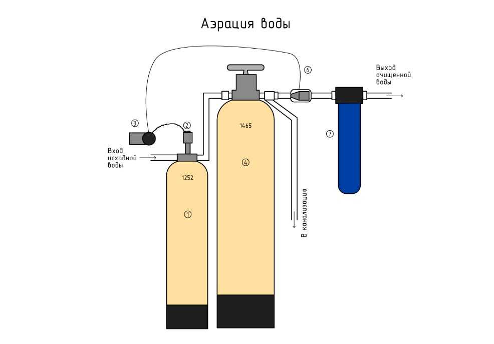Данный метод обеспечивает более полное очищение воды из скважины, чем предыдущий способ. Принцип его действия довольно прост: обеспечивается контакт воды с воздухом, где примеси железа вступают в реакцию с кислородом. Таким образом, элемент окисляется и переходит в трехвалентное состояние, выпадая при этом в осадок. Именно для этого на выходе из емкости устанавливается специальный фильтр, который задерживает частицы и не дает им пройти по водопроводу дальше. Аэрационная система очистки воды от железа – отличный и недорогой выбор для дачи.
