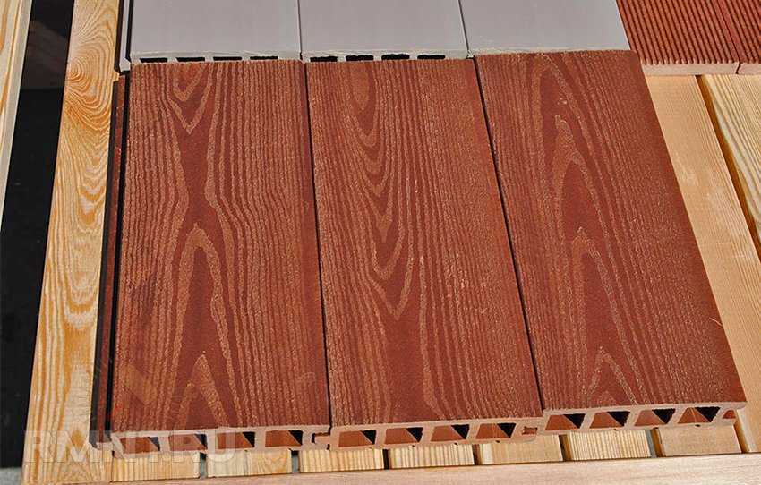 Преимущества перед традиционным материалом: от дерева доску ДПК выгодно отличает сплошной прокрас и лучшие физические показатели (прочность, гибкость, точность обработки). Многие виды доски ДПК выпускают двусторонними — с рельефами массива дерева и ребристой нарезкой.