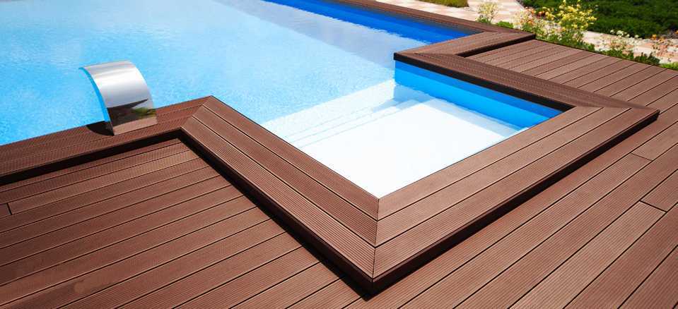 - ландшафтный дизайн. Из полимерно-древесного композита изготавливают настилы (декинги), тротуары, изгороди, заборы, садовую архитектуру (скамейки, беседки), надворные сооружения, детские площадки. Также им отделывают бассейны и используют как напольное покрытие