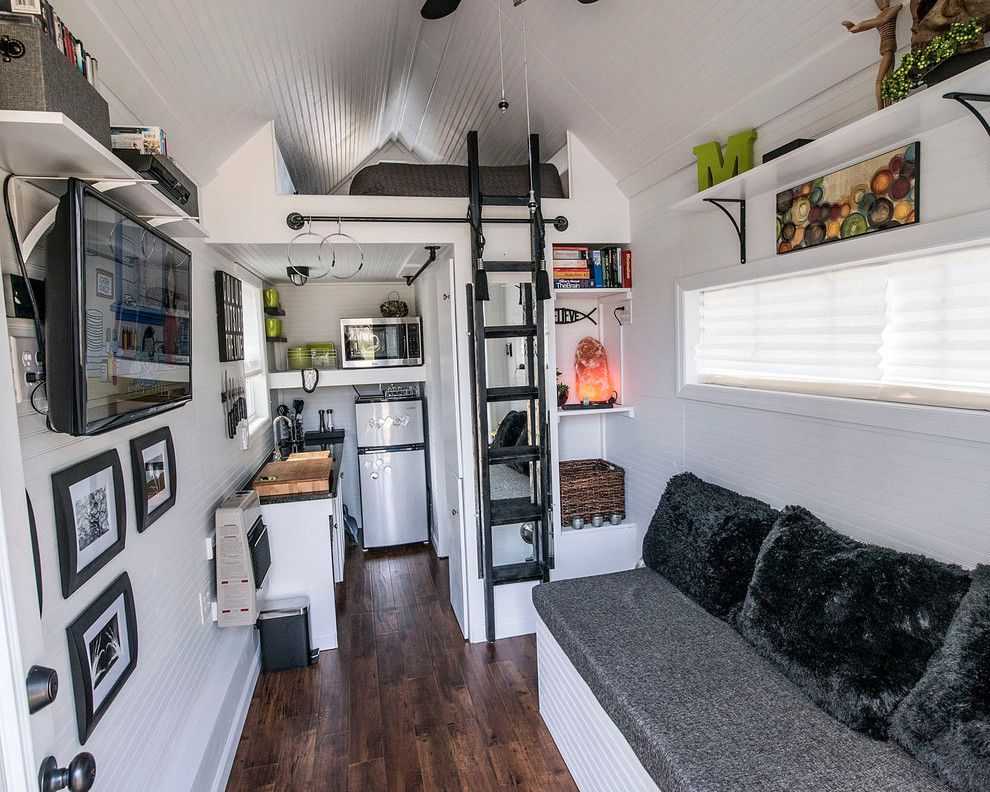 Если потолки в квартире высокие, то подойдет вариант с возведением второго яруса для спального места, или же можно просто приподнять кровать вверх. Подобная конструкция выглядит интересно, и существенно экономит место. Нужно побеспокоиться об освещении в спальном месте.