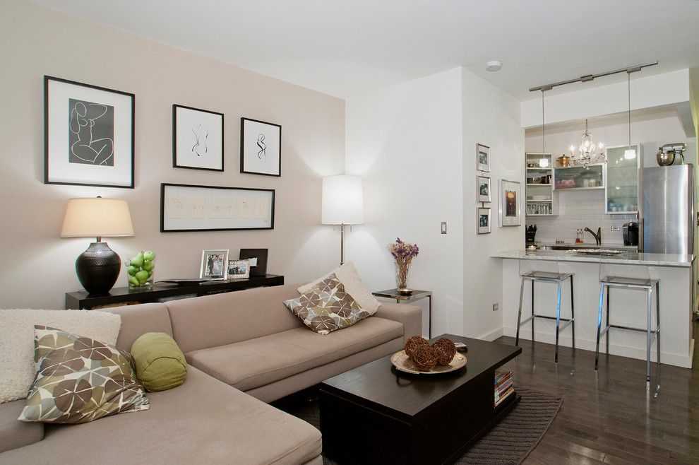 Для квартир-студий жилую зону следует прорабатывать одновременно с кухней, чтобы интерьер смотрелся гармонично.