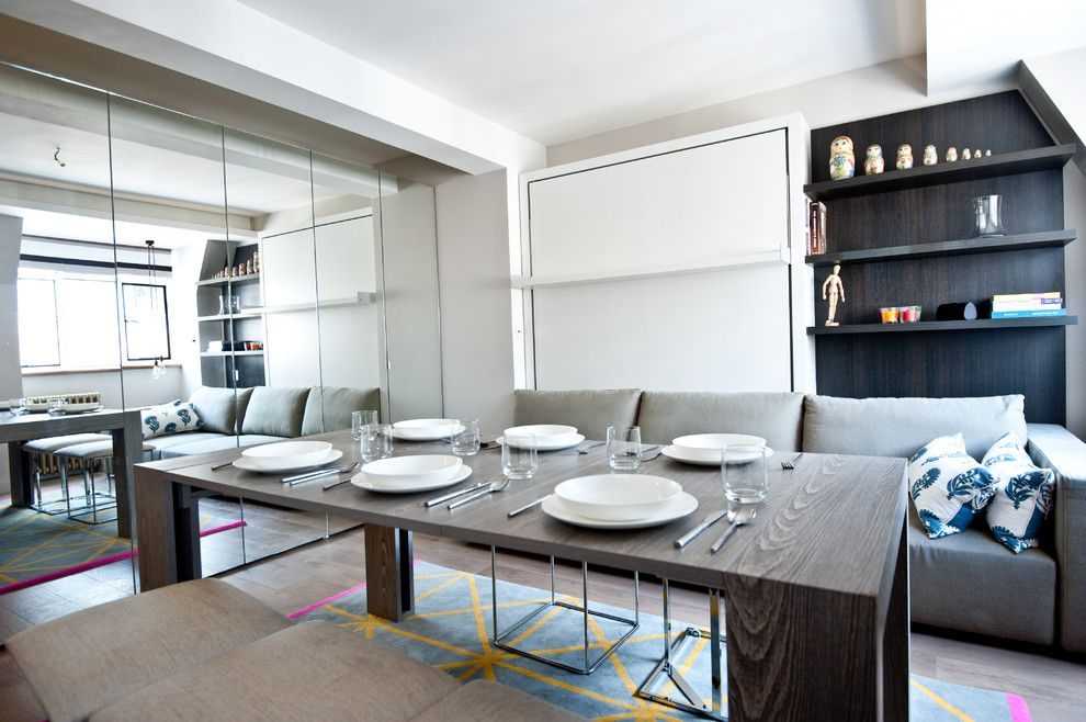 Этот вариант можно отнести к транспортируемой мебели, только она будет прятаться в стене, потолке или в полу. Подъемную или встроенную кровать установить гораздо сложнее. Но, с такой конструкцией добавиться свободное место и она будет смотреться эффектно.