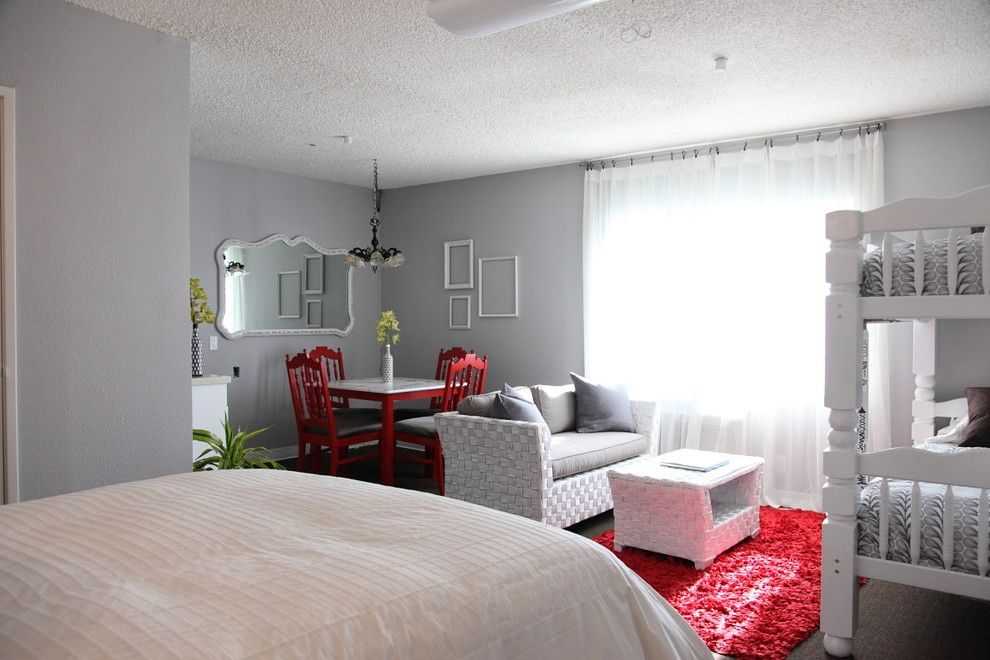 Белая отделка стен и потолка в сочетании с яркой мебелью выглядит интересно и не тяжело