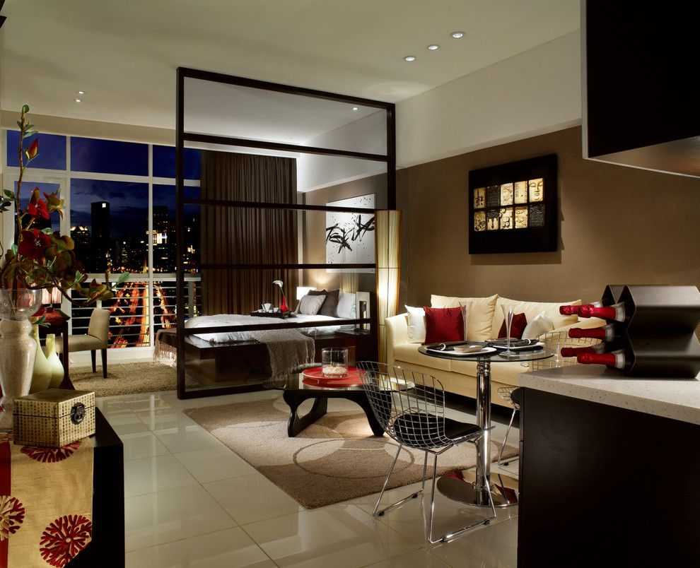 Если небольшую квартиру занимает один человек или молодая пара, самым простым способом разделения пространства на зоны будет использование обоев, подсветки и правильная расстановка мебели. Здесь достаточно трех зон: кухни, гостиной и спальни. Их не обязательно огораживают, просто декоративно выделяют. Иногда наоборот увеличивают помещение за счет присоединения балкона или лоджии, даже кухни. А зону приготовления пищи отделяют барной стойкой.