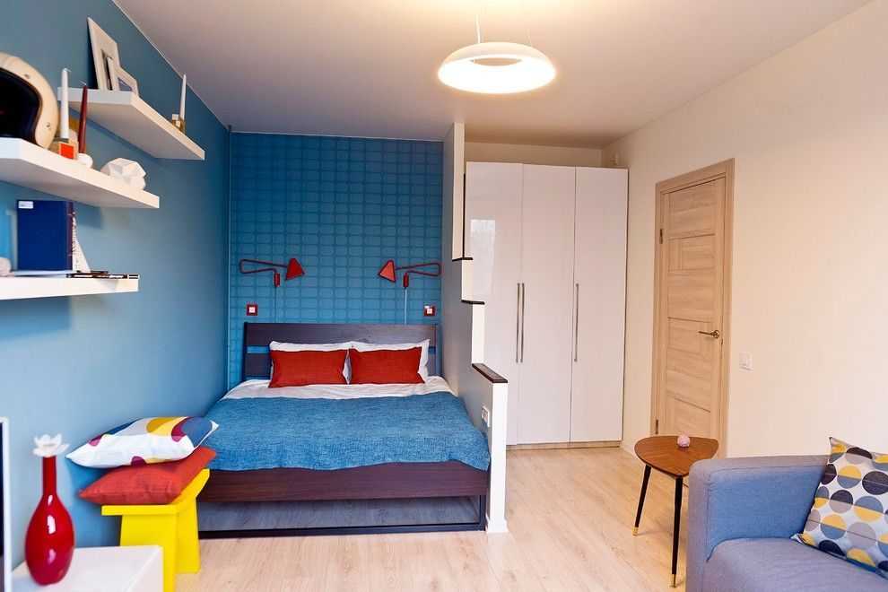 Яркие цвета могут быть использованы для выделения функциональных зон, например, для окраски одной из стен, перегородки.