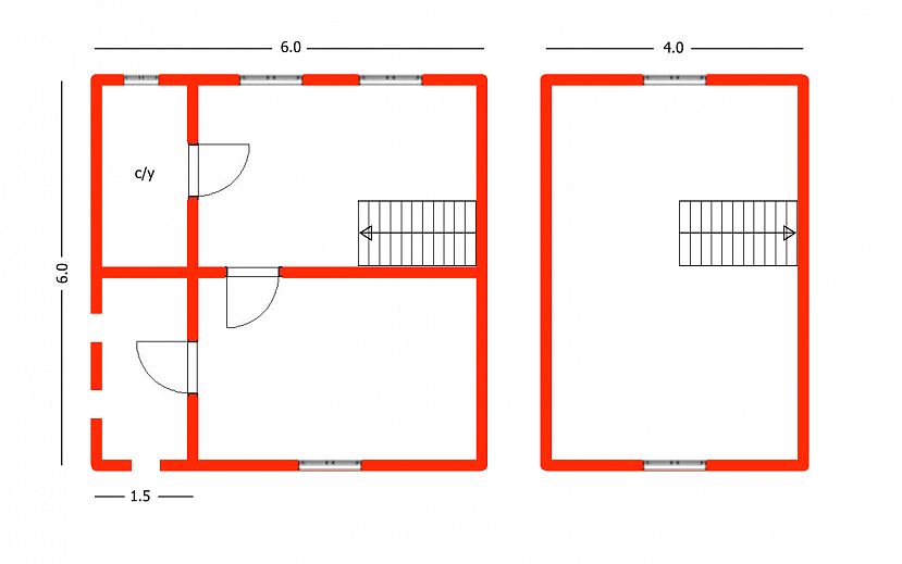 Проект дома 6×8 м внешне выглядит как квадрат, но за счёт дополнительного метража можно удачно расположить лестничную конструкцию и включить в планировку дополнительный санузел. Дополнительные метры можно использовать и в других целях, при этом нет урезания других помещений.