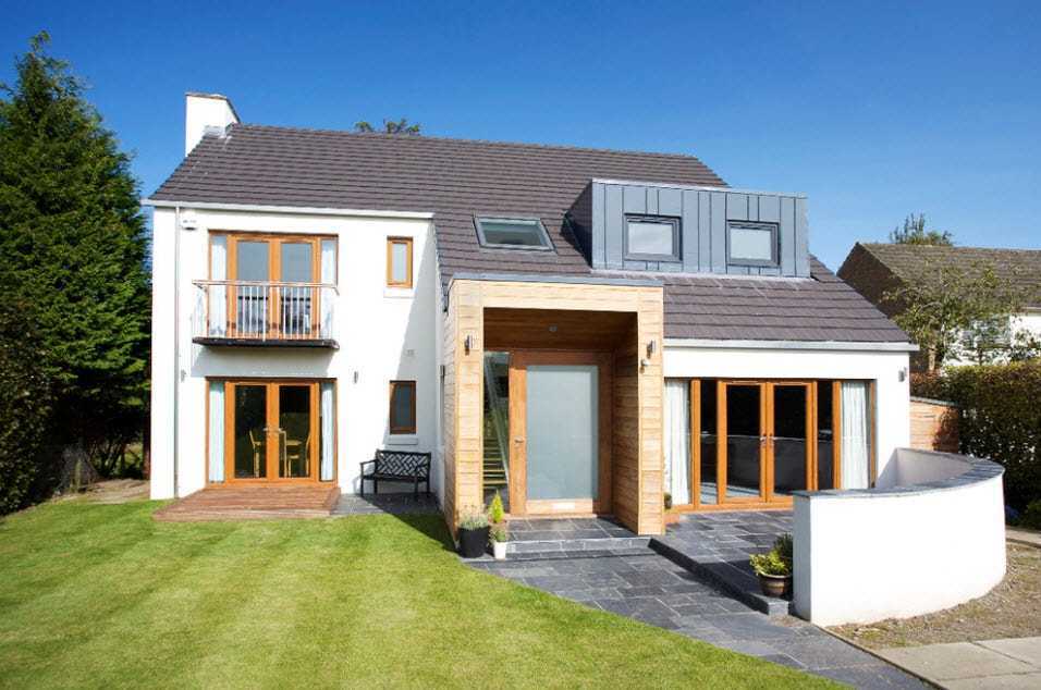 Её полной противоположностью выступает лестничная клетка, примыкающая к дому снаружи. В этом случае концепция структуры жилья не исключает создание даже двух независимых квартир. Например, один из таких эскизов проекта дома с лестницей сбоку архитектор может предложить заказчикам, предполагающим совместное проживание нескольких поколений семьи, а также хлебосольным хозяевам, принимающим регулярно гостей. Пожилым людям всегда найдется место для отдыха, а молодежи для развлечений, где они не будут мешать окружающим.